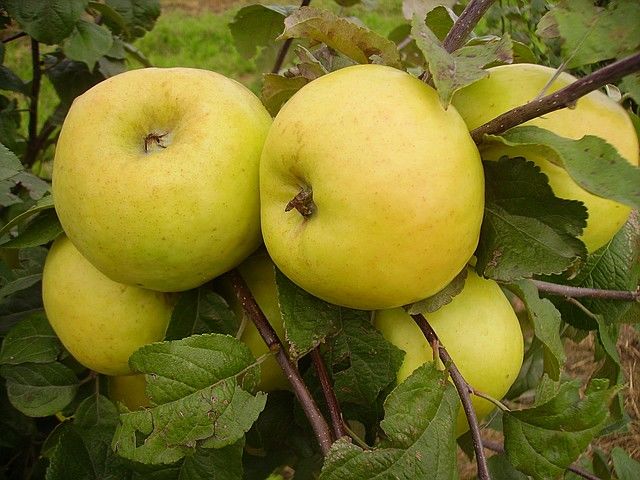 Плоды средней величины (125 г), плоскоокруглой формы. Основная окраска в момент съёмной зрелости зеленовато-жёлтая, покровная – красная в виде нежного размытого румянца по солнечной части плода.