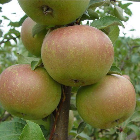 Плоды очень крупные (до 250 г), плоскоокруглой формы. Основная окраска светло-зелёная, покровная кирпично-красная в виде размытого румянца на солнечной стороне плода.
