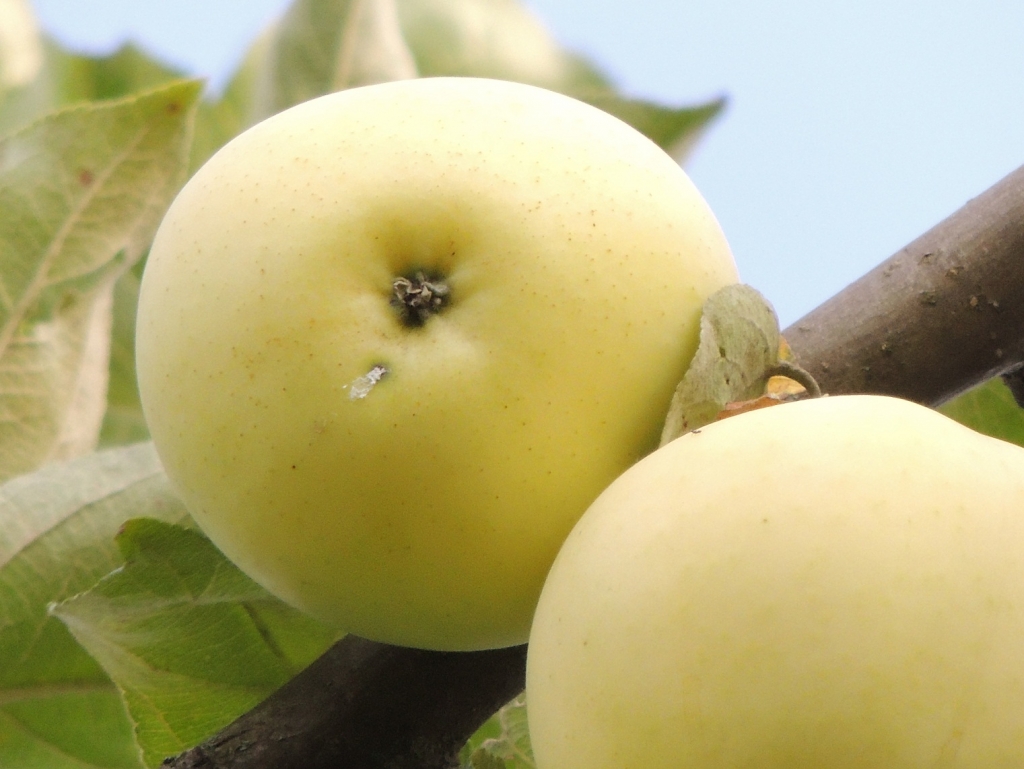 Плоды округло-конические, плавно сужающиеся к чашечке, равнобокие, зеленовато-белые имеют небольшой румянец с южной стороны. Средний вес яблока 60 г. (от взрослой яблони), 120-150 г. (от молодой яблони). Под тонкой, нежной кожицей проступают крупные зеленоватые, иногда белые точки.