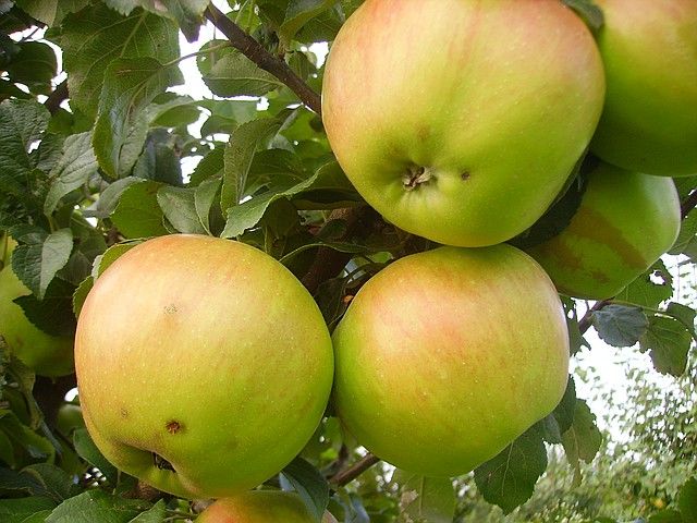 Плоды очень крупные (до 250 г), плоскоокруглой формы. Основная окраска светло-зелёная, покровная кирпично-красная в виде размытого румянца на солнечной стороне плода.